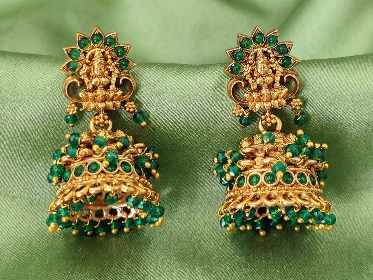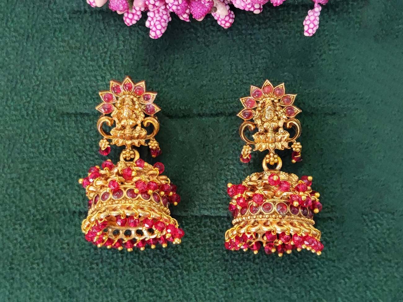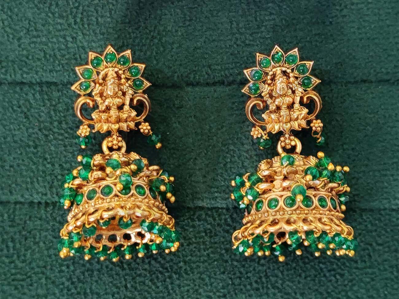 Be the first to review “Temple God Laxmi Design Full Stone Jhumka in Rajwadi Polish for Women & Girls | High Gold Bridal & Festive Jhumki Earrings for Saree & Lehenga”