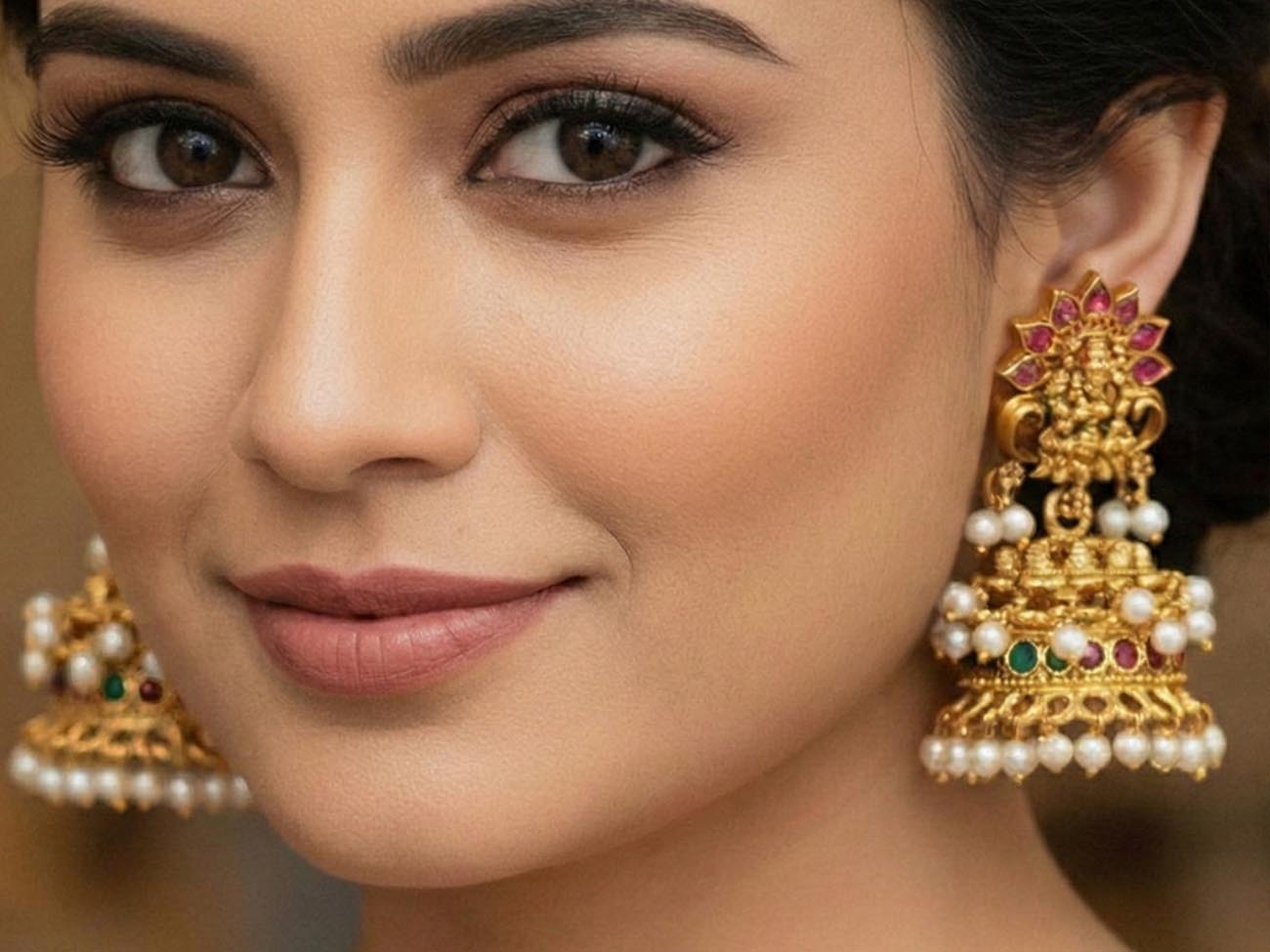 This Temple Design Full Stone Jhumka in Rajwadi Polish features an ornate temple‑style dome fully embellished with sparkling stones, finished in a rich rajwadi high‑gold tone for a royal bridal look. The heavy‑look jhumka silhouette pairs beautifully with silk sarees, lehengas, and Anarkali suits, making it perfect for weddings, receptions, poojas, and festive occasions while still remaining comfortable enough for long wear. Ideal for women and girls who love statement temple jewellery, these earrings add instant glamour and photograph beautifully for reels and candid shots.